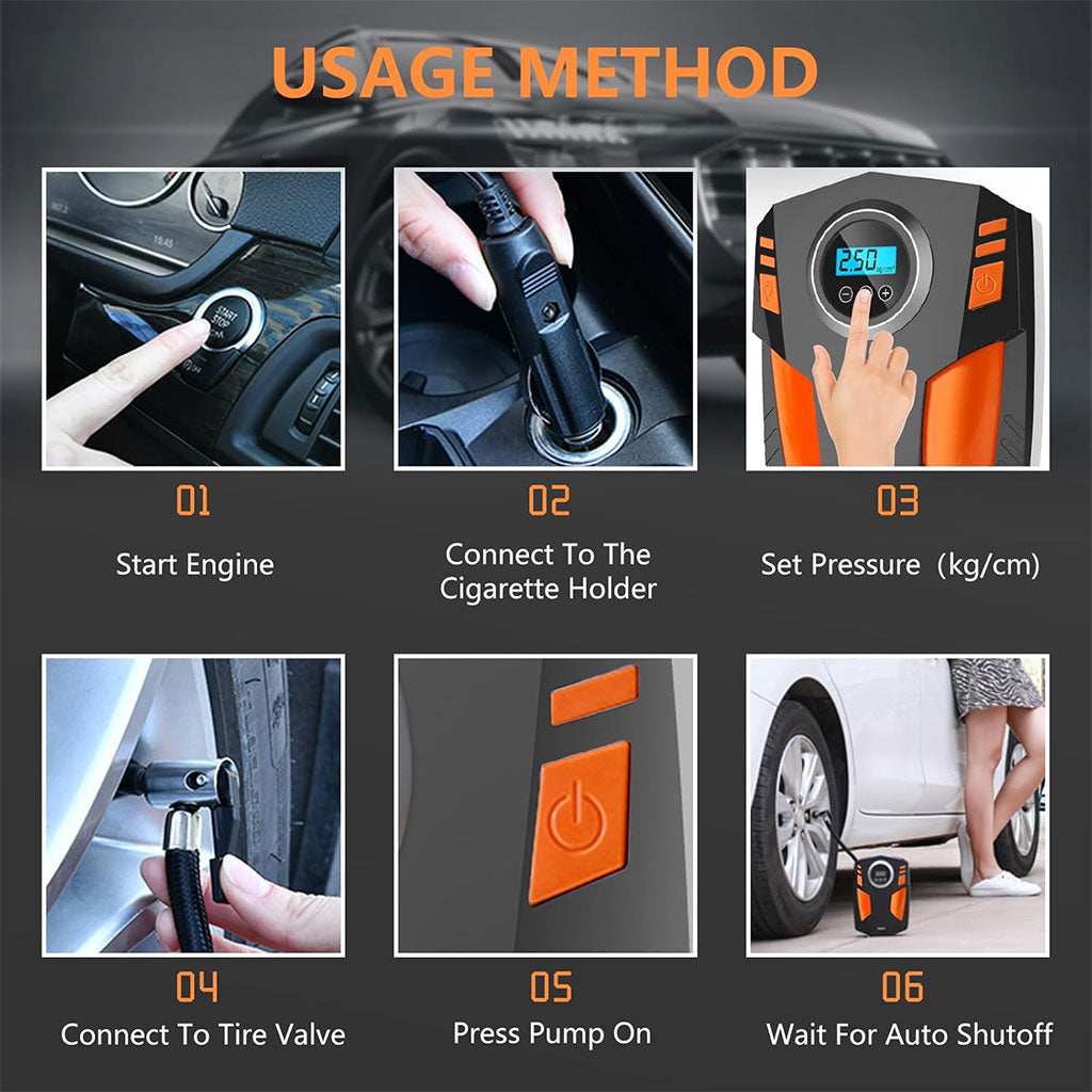 - Lumière LED d’urgence-Le compresseur d’air numérique du gonfleur de pneu est équipé d’une lumière LED pour éviter les accidents de la route dus aux problèmes de pression des pneus. Il peut également être utilisé comme une lampe de poche, de sorte que vous pouvez trouver la valve de votre pneu dans un environnement de faible luminosité ou sombre.
